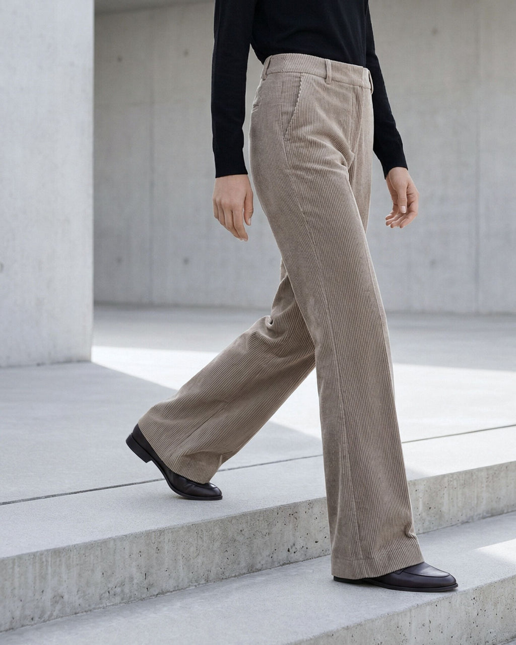 Amelie-buksen fra Cambio kombinerer klassisk eleganse med moderne komfort. Den er skreddersydd i en strukturert, elastisk cordblanding som gir en flatterende silhuett og føles eksklusiv mot huden. Den høye midjen og de rette, vide bena med lett utsving skaper et sofistikert uttrykk, like perfekt til kontoret som til en middag ute.
