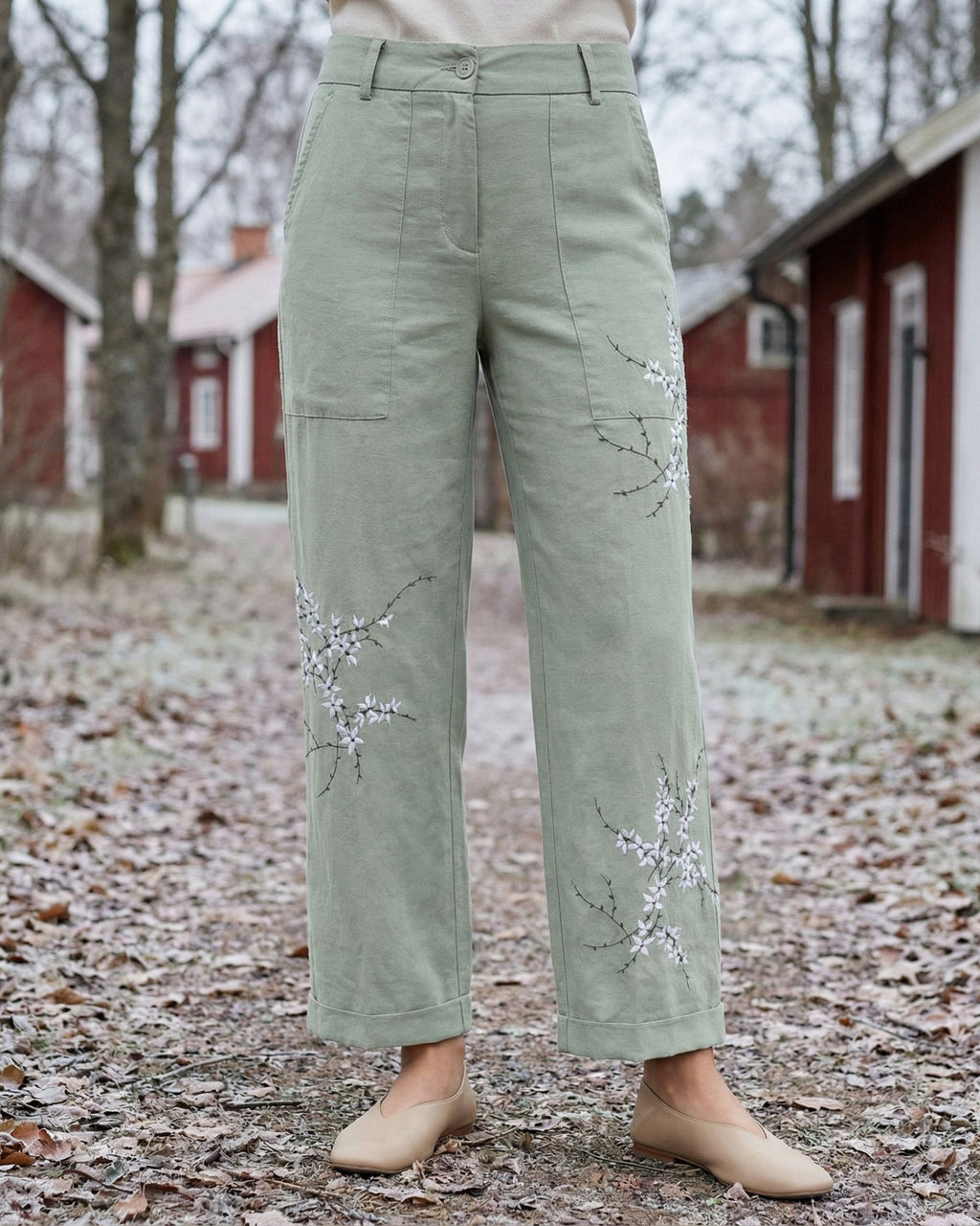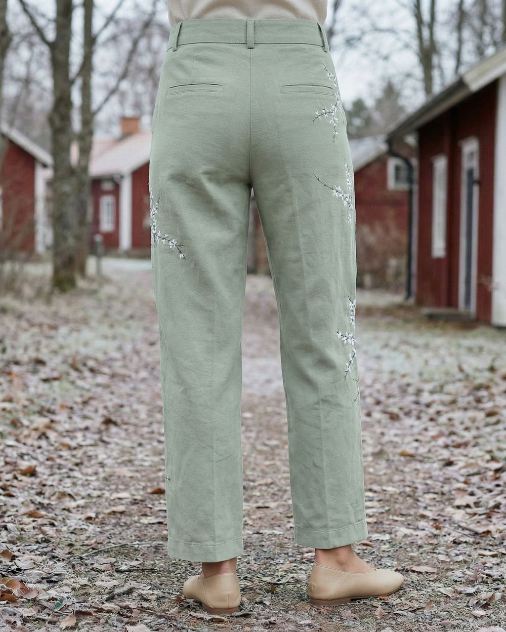 En elegant bukse fra Cambio som kombinerer stil og komfort på en nydelig måte. Høyt liv med beltehemper. Vide og utsvingene ben skaper en raffinert look som passer perfekt til både formelle og uformelle anledninger. Skrå sidelommer og passepoilerte lommer bak. Nydelig bukse med brodert utsmykning. Rekker til ankelen.