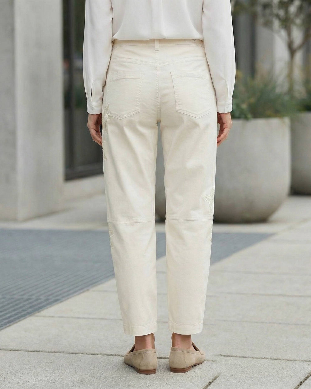 Jeans med vidde i bena som svinger litt innover, fra Cambio. Tøff eggehvit jeans med skrå lommer og høyt liv. Legg merke til de nydelige broderte blomstene på siden.