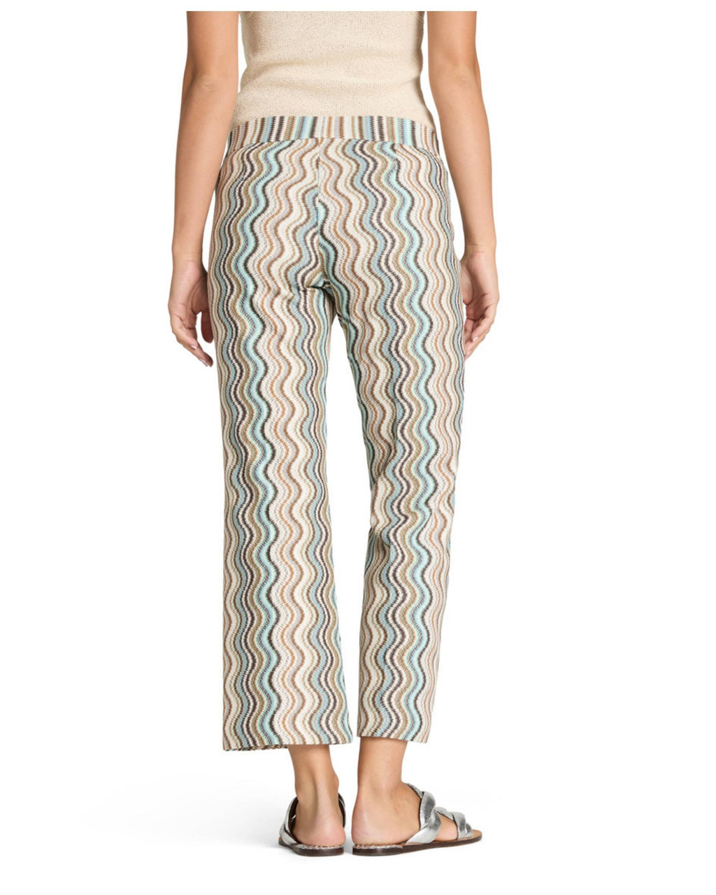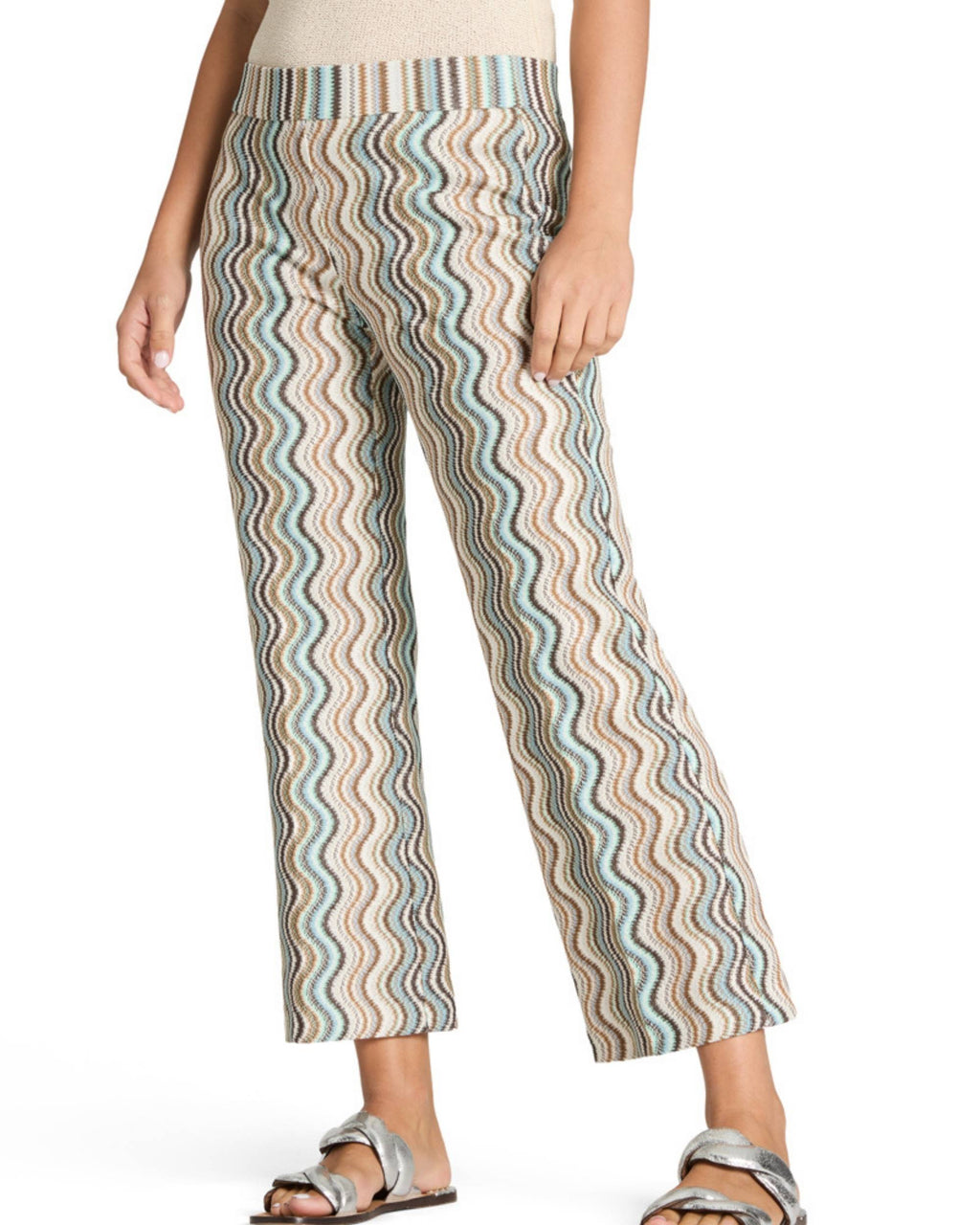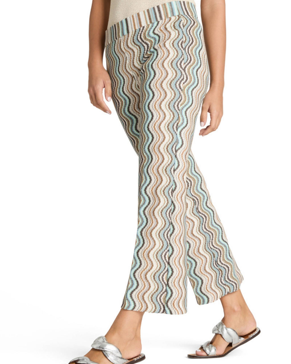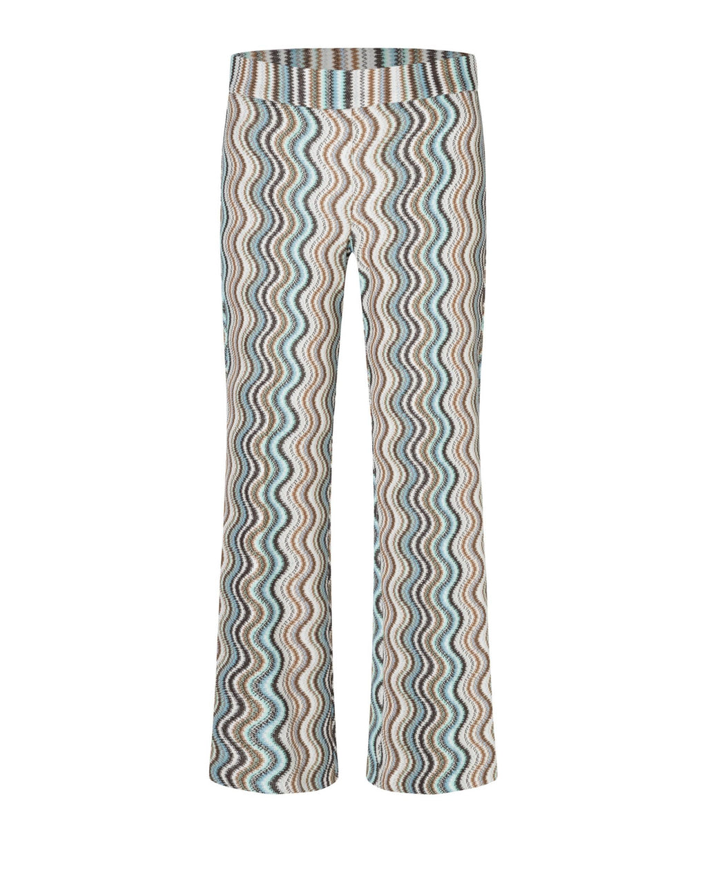 Faith strikket bukse til dame fra Cambio i aqua, lys brun og krem. Det eksklusive buksemerket fra Tyskland er kjent for sin perfekte passform, moderne snitt og høye kvalitet. Takket være den elastiske linningen og det rette snittet er denne modellen også en stilfull følgesvenn med et avslappet preg, mens det bølgende strikkemønsteret med glitterfibre gir et moteriktig boho-uttrykk.