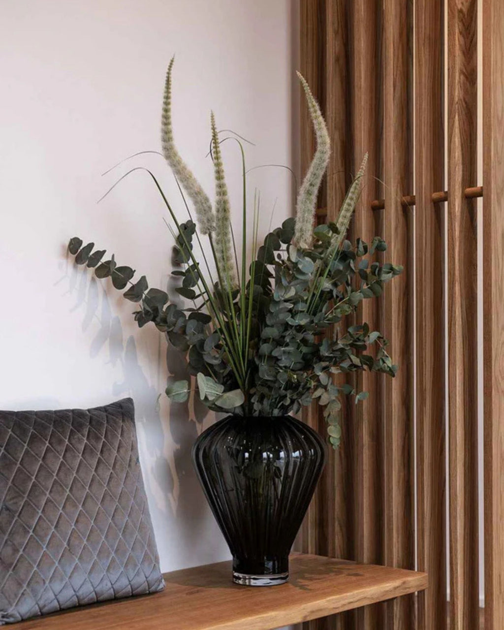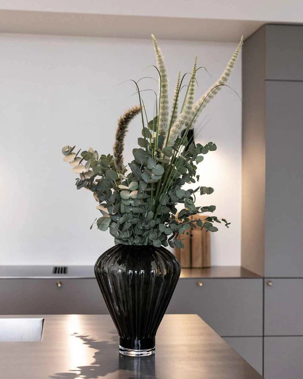 Med sine myke linjer, karakteristiske rifler og generøse form er Evelyn-vasen perfekt både til store buketter og som et dekorativt element i seg selv.