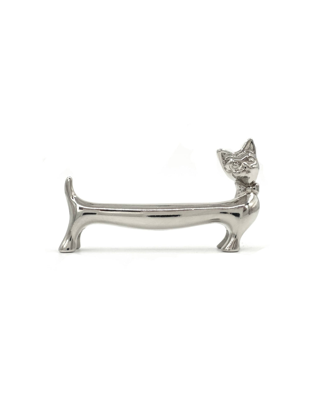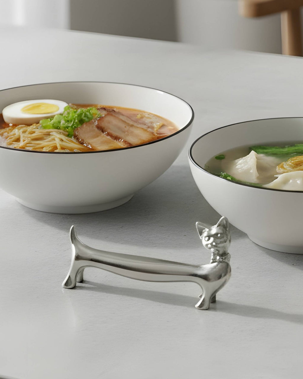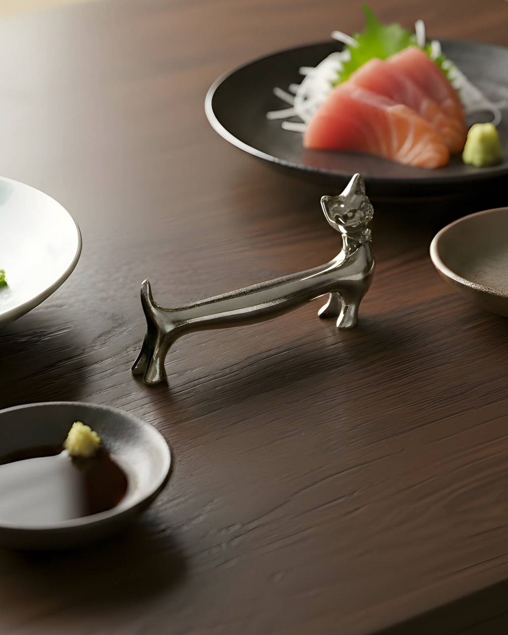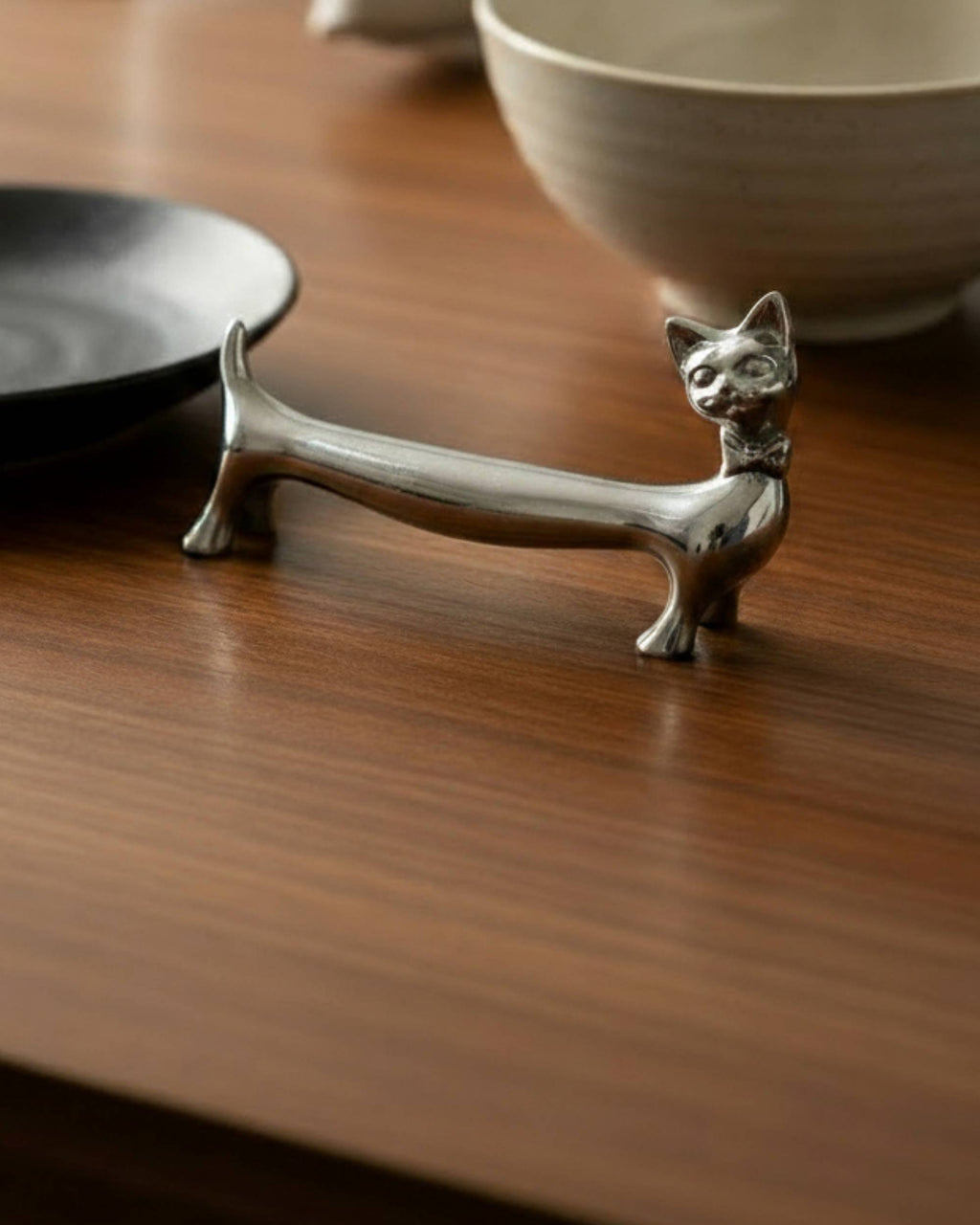 Gi borddekkingen et snev av eleganse og personlighet med denne bestikkhvilen formet som en katt. Laget av 100 % rustfritt stål, kombinerer den minimalistisk design med funksjonell kvalitet. Den holder bestikk, sushipinner eller serveringsredskaper pent løftet fra bordflaten - perfekt for å beskytte duk og bordplate mot flekker.