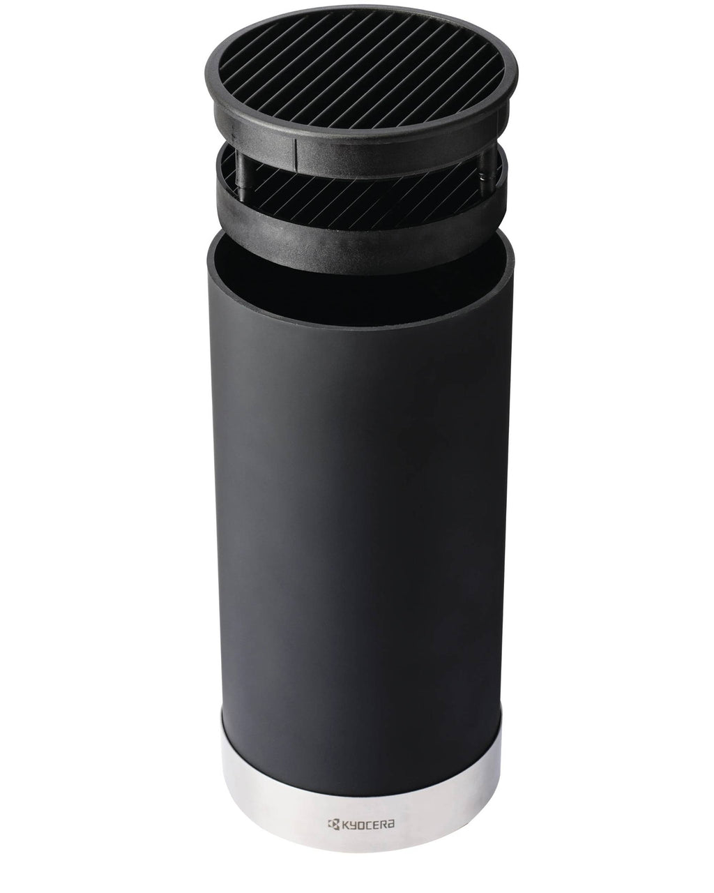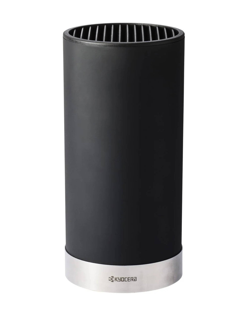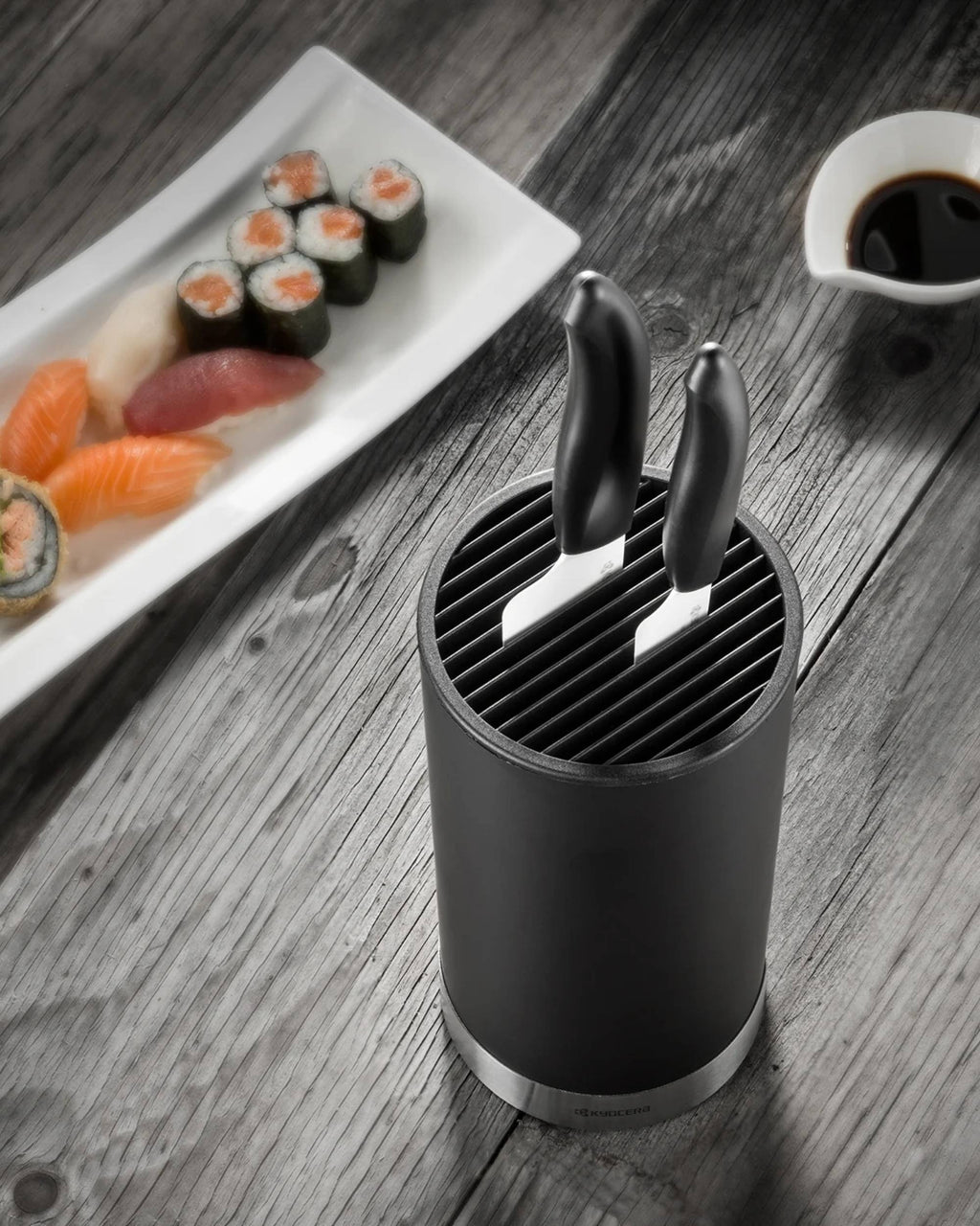 Denne smekre knivholderen fra Kyocera rommer opptil 8 kniver. Den kan åpnes opp slik at man kan få vasket den - og bli kvitt støv og smuler.