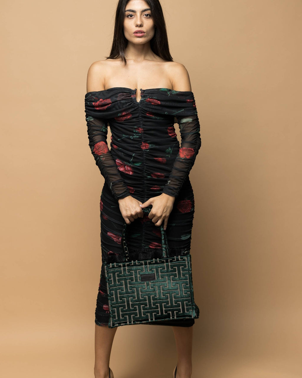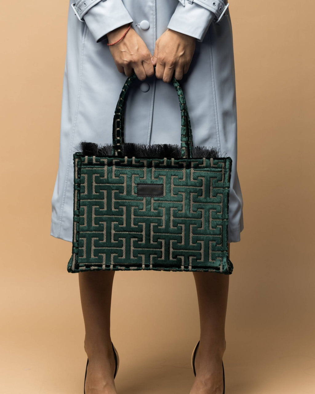 Nafsika Medium, en nydelige veske laget i luksuriøst fløyel med vakkert abstrakt motiv i vakre farger. Alle veskene i denne serien er håndlaget i Hellas.