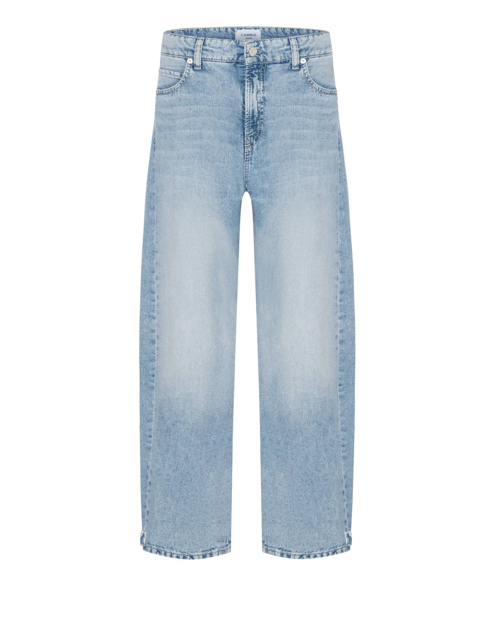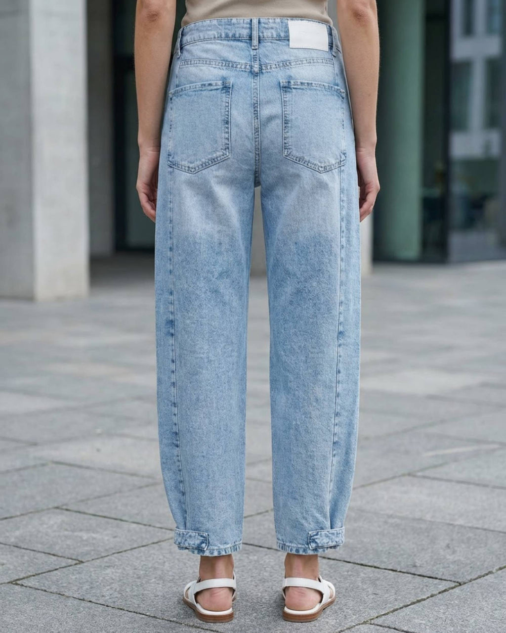Kule lyseblå jeans i barrel fit. Løst sittende jeans med høyt liv og full ben lengde. Hempe nede på ben som kan gjøre buksen til vide ben.