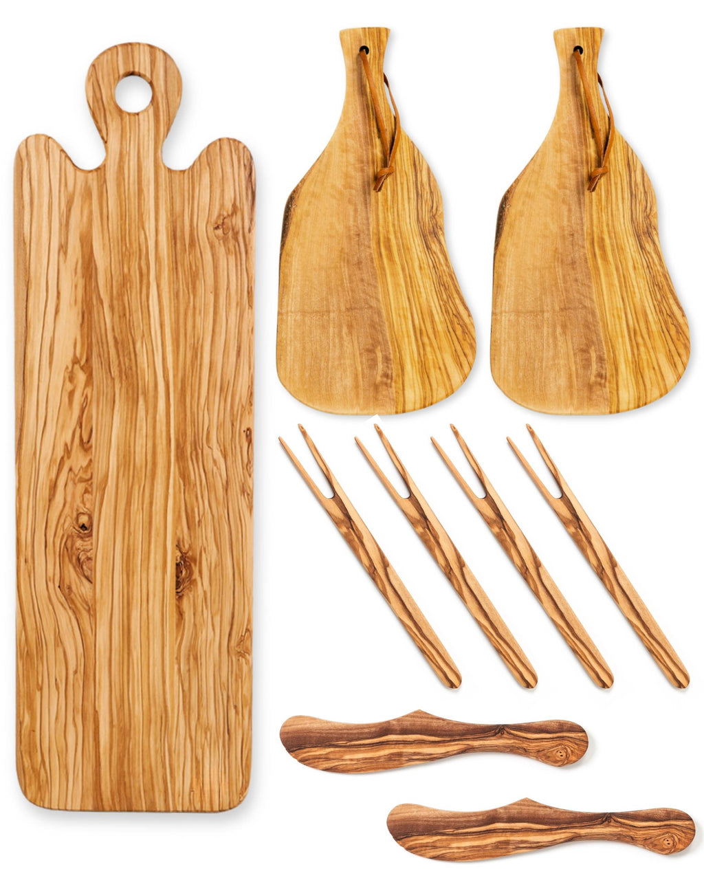 Sett bestående av 9 oliventreprodukter i håndlaget oliventre. Dette er den perfekte pakken til servering av forretter, fingermat, spekemat, osv. Her har du alt du trenger.