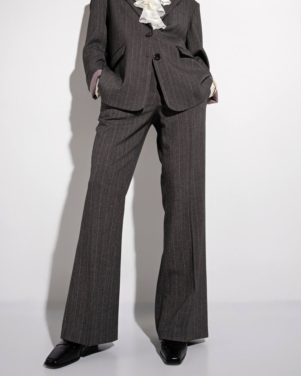 Porter er en velsittende bukse med trendy pinstripe-mønster og stretch i stoffet. Den sitter på hoftene og har flared ben for et moderne uttrykk. Fargen er brun melert med diskrete, lysere striper som passer perfekt til høstens toner. Kombiner gjerne med Phenix blazer i samme stoff for et komplett sett.