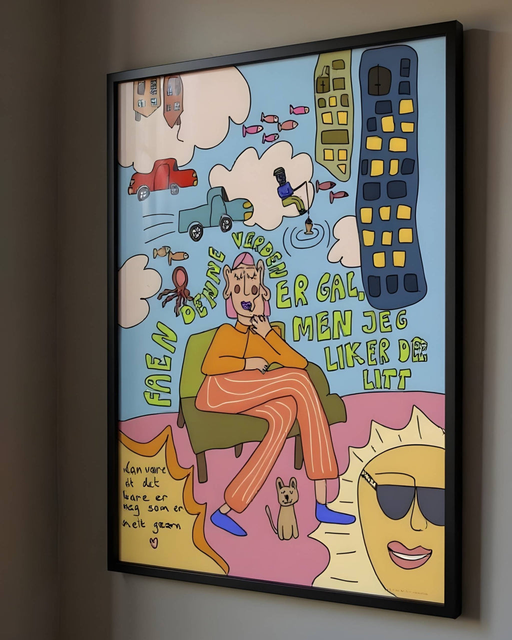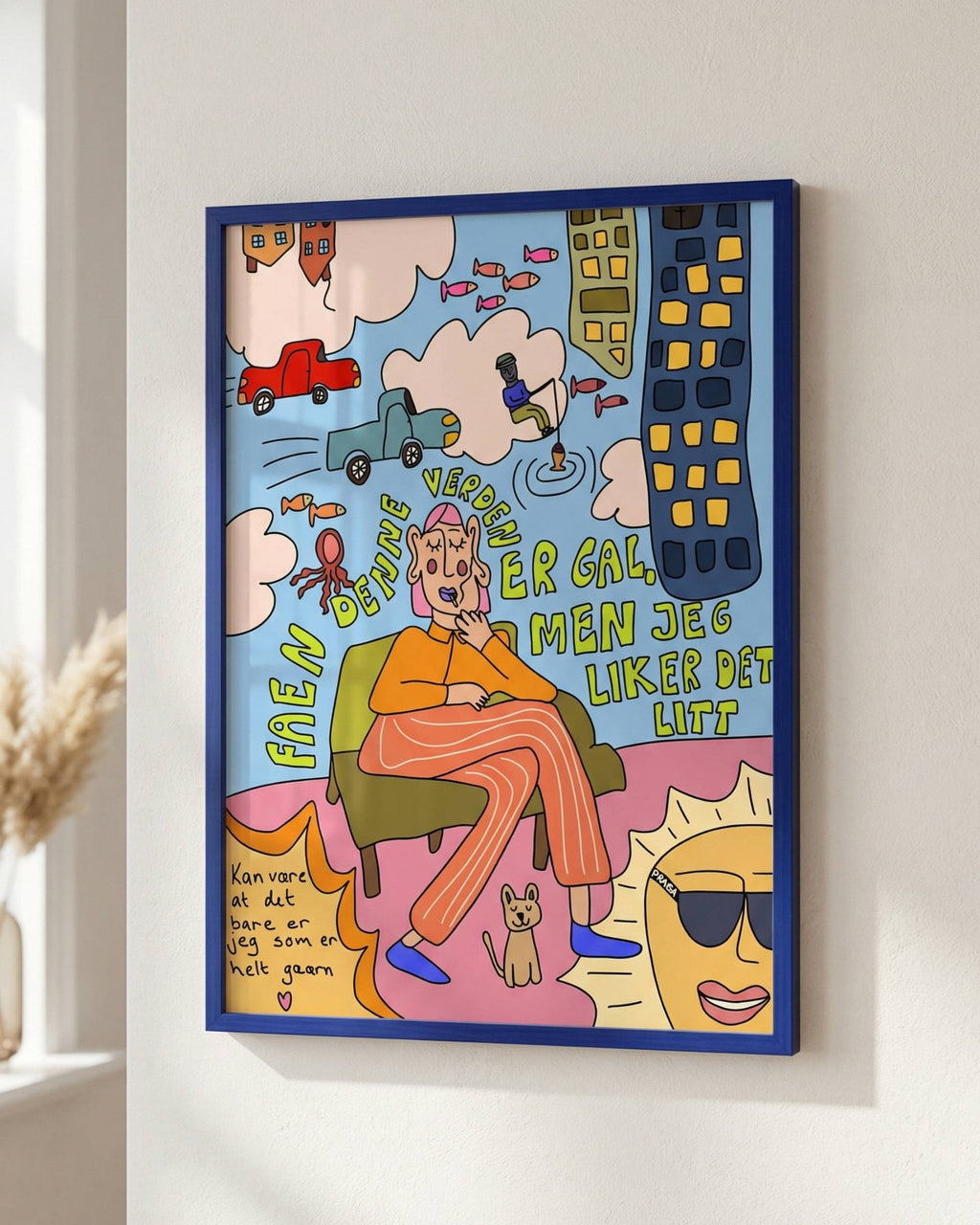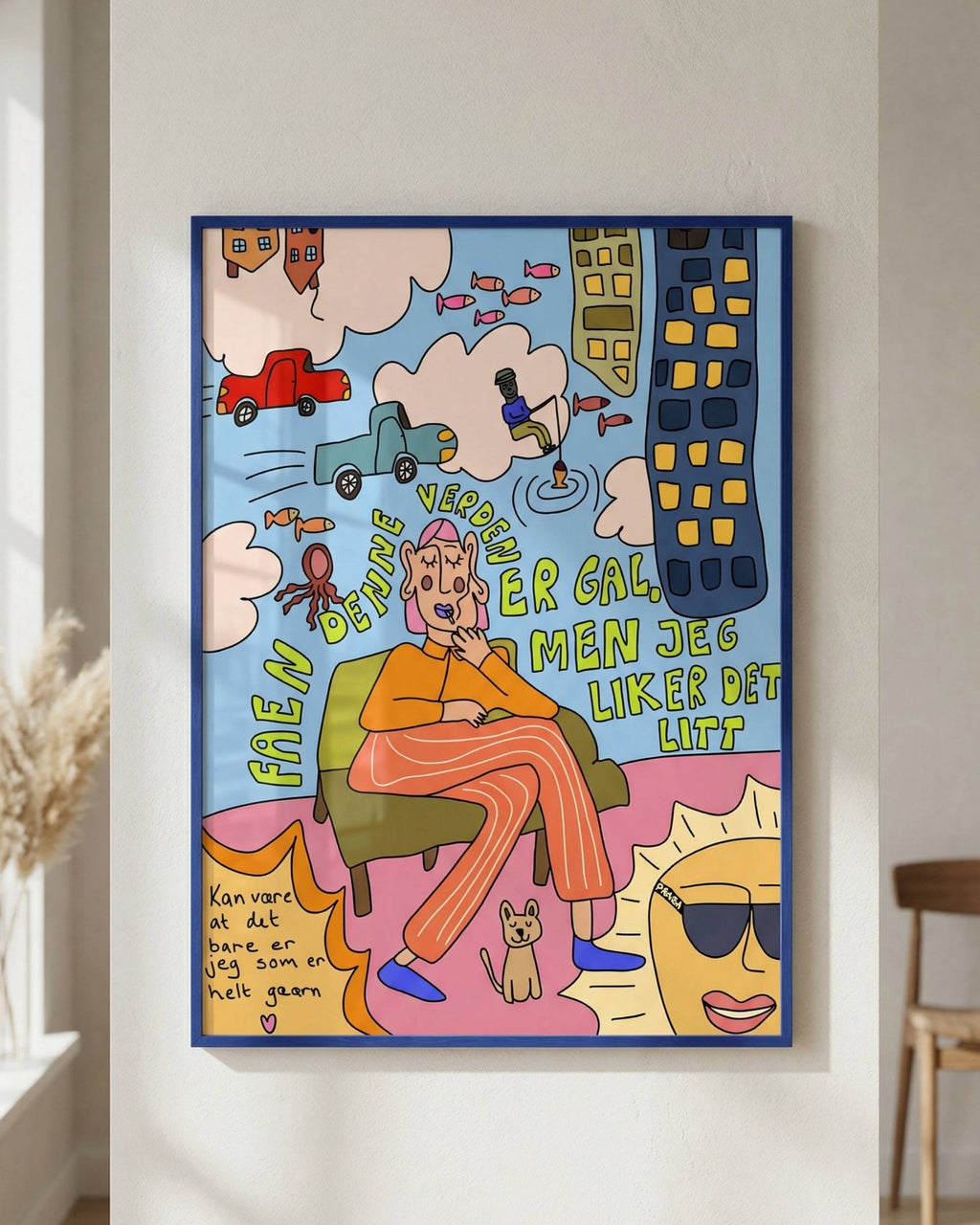 Verden er så gal, men jeg liker det er et print med masse personlighet, humor og en liten dose kaos (på den beste måten). Perfekt for deg som liker interiør med glimt i øyet – og som vil ha en plakat som både får folk til å smile og nikke gjenkjennende.