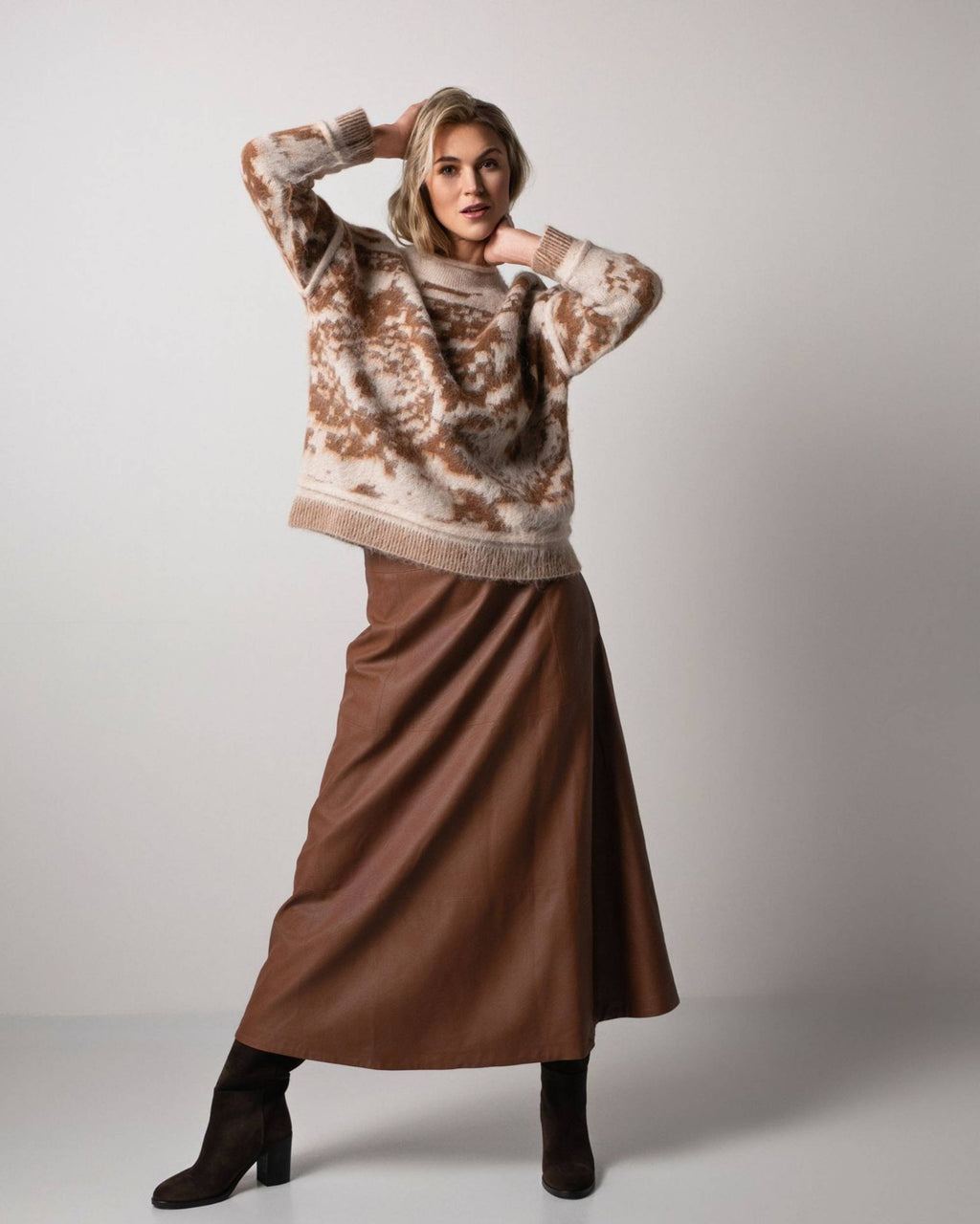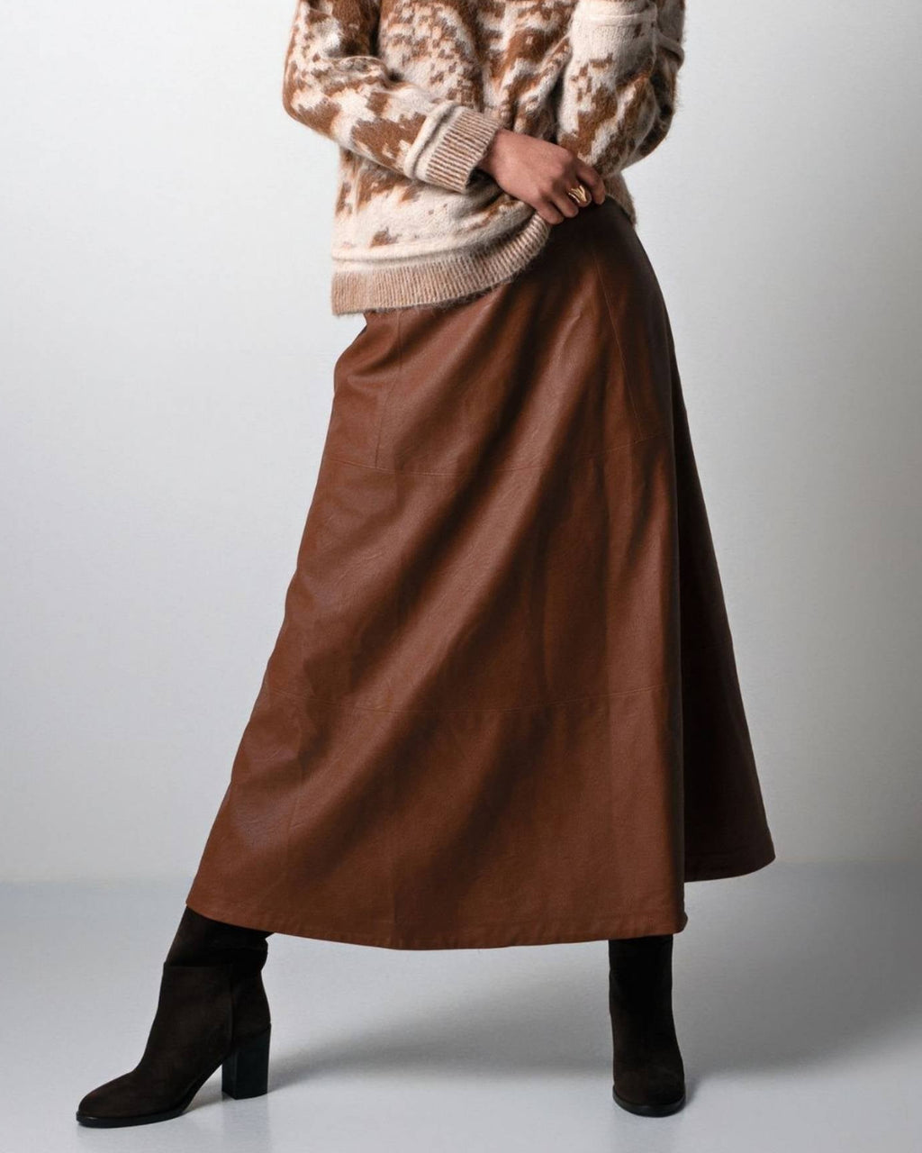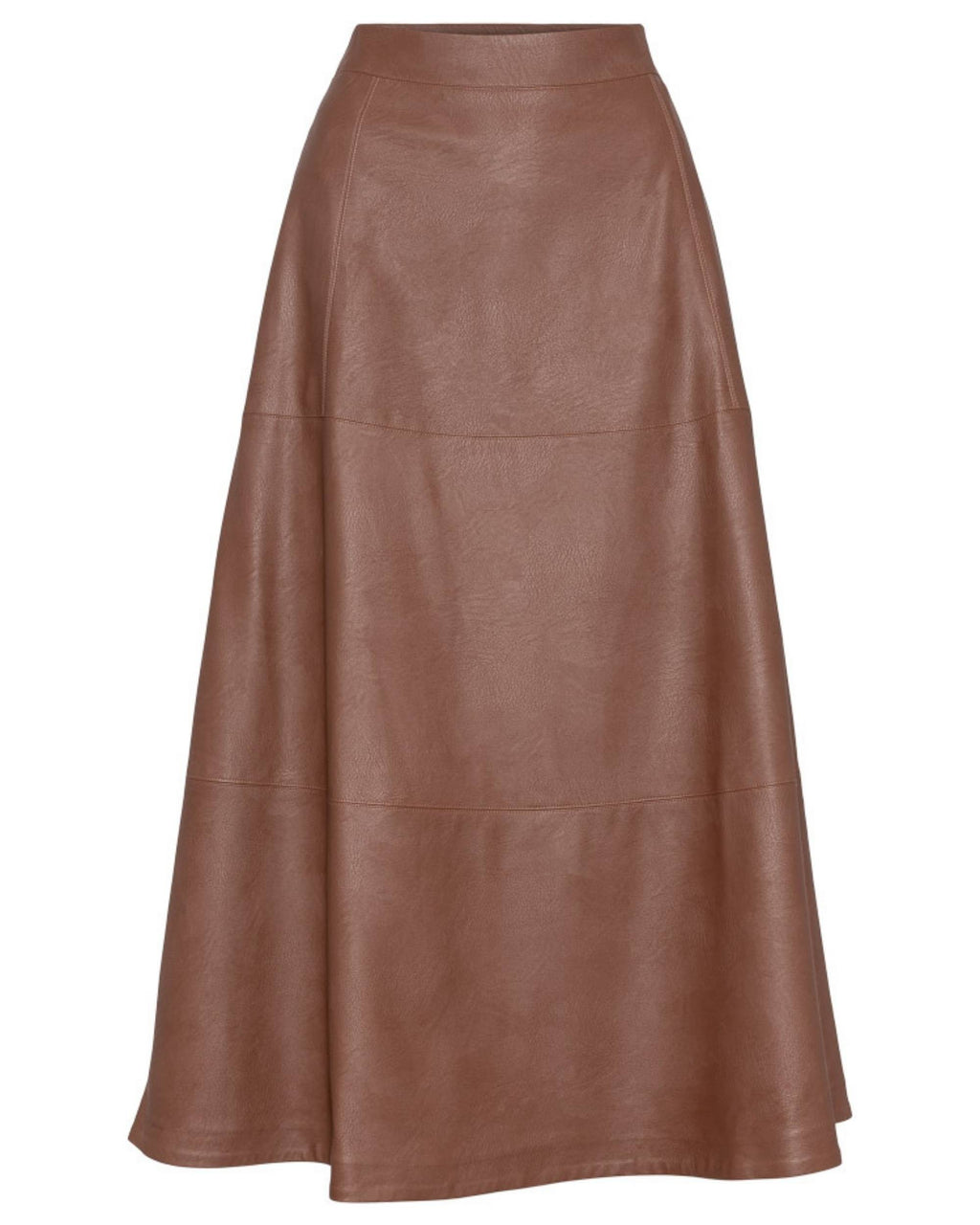 Rachel er et lekkert, vegansk skjørt som kombinerer stil og komfort. Det myke materialet har en eksklusiv skinnlook som både ser og føles luksuriøs - helt uten ekte skinn. Skjørtet faller vakkert over hoftene, har en lett utskrådd fasong som gir flatterende bevegelse, og praktiske lommer i sidene. Det er halvforet for en behagelig passform og fin struktur.