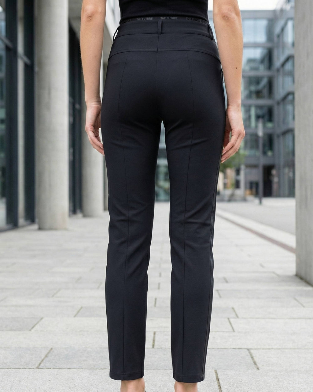 Rarity er en sporty dressbukse fra Cambio med høyt liv og rette smale ben. Komfortabel med masse stretch og strikk i livet. Beltehemper og lommer foran med glidelås og blankt stoff langs glidelåsen og i ytterkant i benlengden. Sydd press foran og bak.