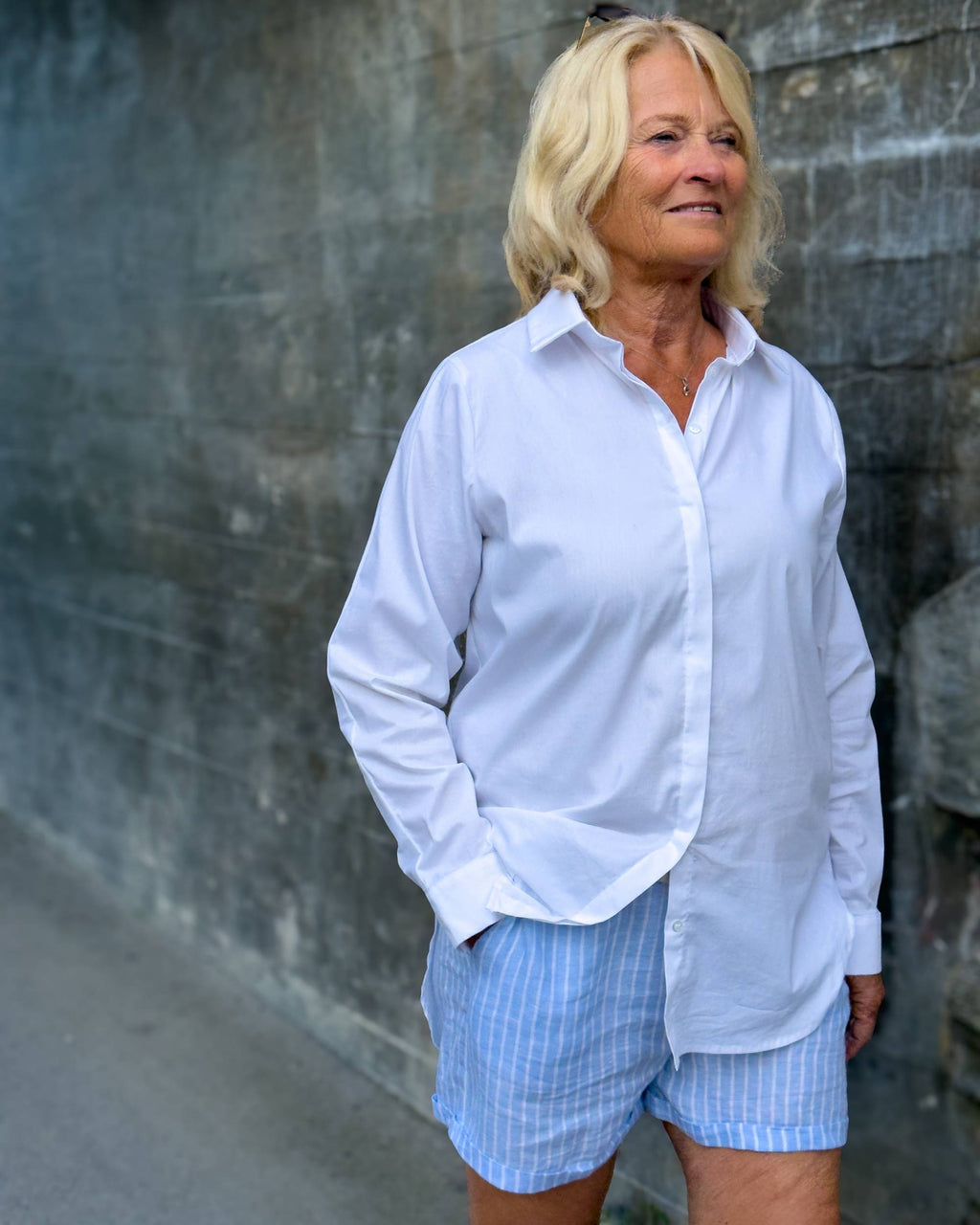 Sasha shorts er en deilig og luftig sommershorts i 100% lin. Den passer like godt på stranden som hjemme, og kan brukes som pysjshorts. Kombineres perfekt med Stacy blusen for et avslappet og helhetlig sett. Normal i størrelsen.