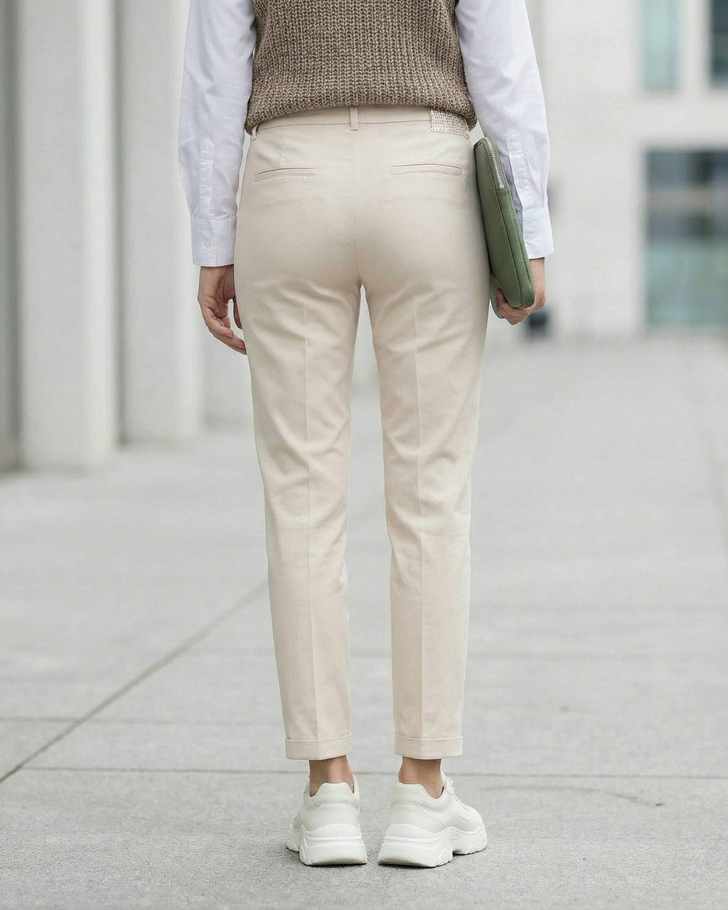 Flott chinos bukse fra Cambio i delikat sandfarge. Superfin modell med lommer i siden og oppbrett nederst Flott passform med stretch, litt kortere på bena. Lommer og glidelås i front, og beltehemper. "Fake"- lommer bak. Kan oppleves som liten, så hvis du ikke ønsker en tettsittende bukse, velg et nummer opp i forhold til normalt.