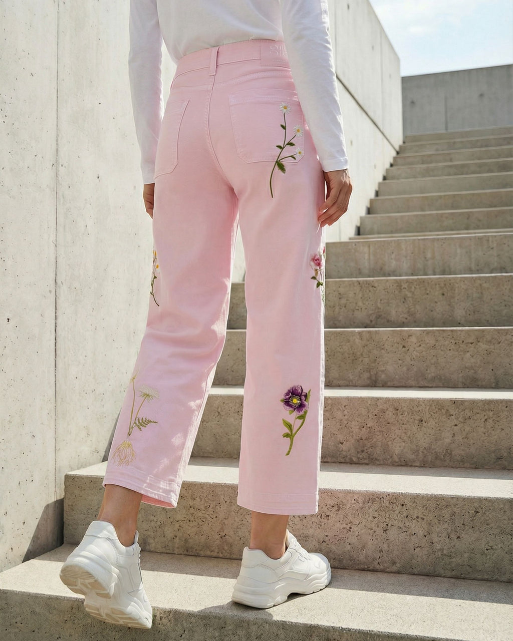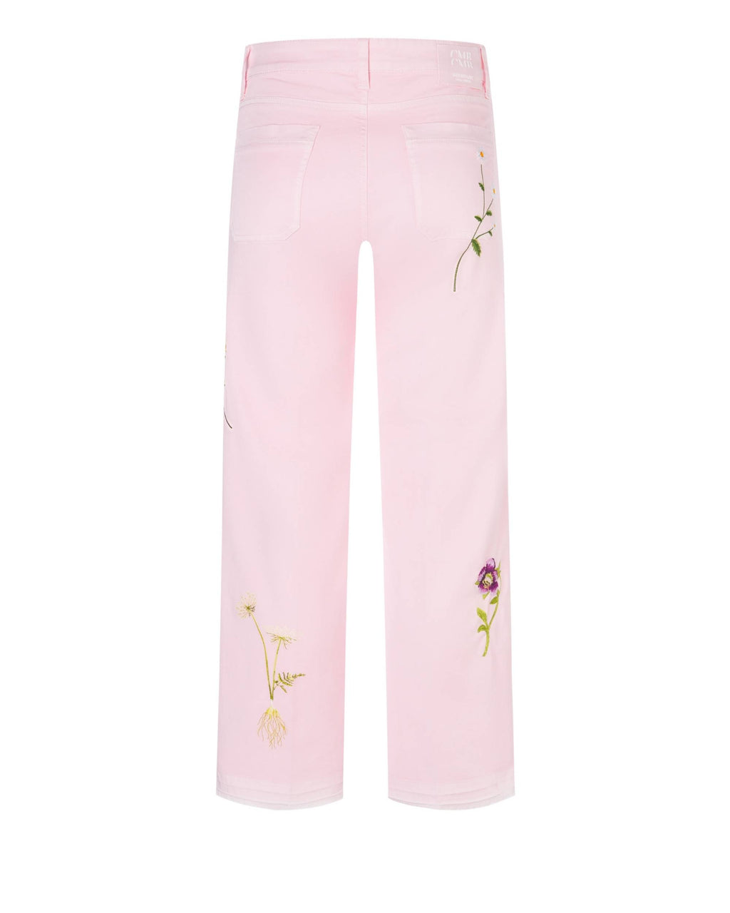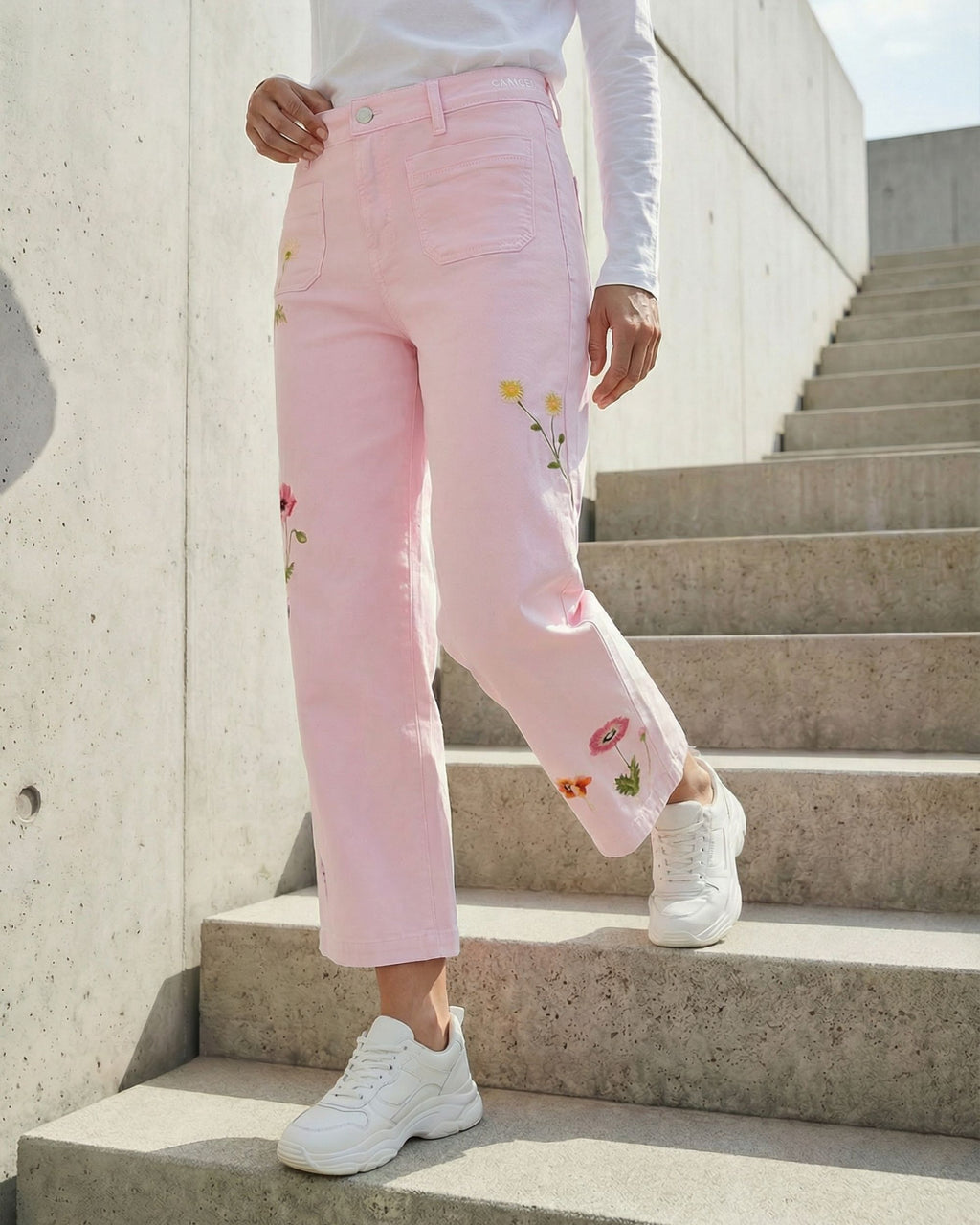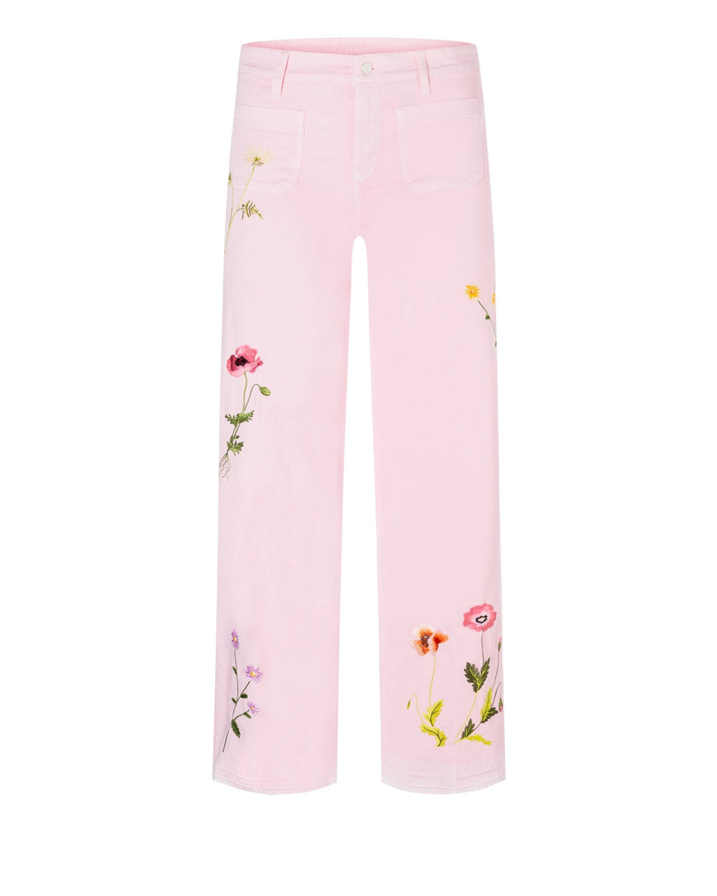 Tess Pocket Cropped Blumenstick er en lys rosa jeans med håndbroderte blomster. Vide, rette ben til ankelen. Tøff modell med rette lommer foran og høyt liv. Sølvknapp til lukking og broderier på lomme både foran og bak. Hemper til belte. Full benlengde på 28 tommer.